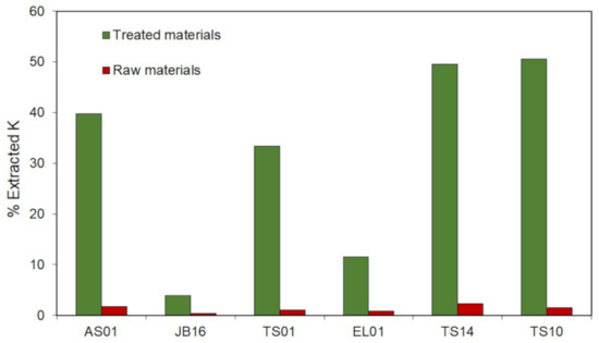 Although water might not be similar to realistic soil conditions (less aggressive than soil), both materials were able to release potassium and the extraction percentages are given in Figure 12 (data in Table S2. Potassium extraction efficiency was less than 3% for raw samples but it reached 50.5% for treated samples. It can also be noted that in the leaching for raw samples, potassium release was correlated to initial potassium content; the higher the potassium content is, the higher the release is. However, this correlation was not observed for treated samples.