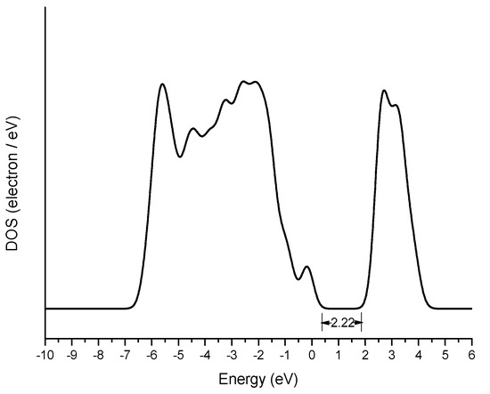 The calculations in this study were done through the CASTEP module in the Materials Studio calculation software based on density functional theory (DFT) [12,13]. In the calculation of FeNb2O6, the DFT method used Perdew Burke and Erzerhof (PBE) and GGA (generalized gradient approximation) for the exchange correlation function [14], and UItrasoft pseudopotential was used to describe the interaction between electrons. When calculating the core-level spectrum, On the fly was used to describe the interaction between electrons [11]. The DFT Kohn-Sham equation was solved by using the projection augmented plane wave method (PAW) [15]. The FeNb2O6 system was studied using DFT + U method. Since both Fe and Nb are transition elements, when calculating with the DFT method, U value was added to correct the Fermi level. The U value on the d orbital of Nb atoms was 3.5 eV, the U value on the p orbital of Fe atoms was 3.5 eV. Figure 1 shows the calculated total DOS of FeNb2O6. It could be seen from the figure that the calculated band gap was 2.22 eV, which was the same as the experimental value [16].