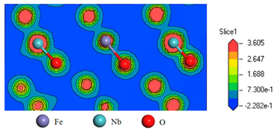Combined with the DFT calculation, the charge density of FeNb2O6 is shown in Figure 6. The overlapping of the electron clouds in Nb–O indicates a covalent bond, and the smaller overlapping of the electron cloud of Fe–O indicates an ionic bond. According to the Hirshfeld charge analysis, after adding H atom and F atom, the charge of Nb in Nb–F was 1.71 e. Compared with the Nb atom in the Nb–O bond (Nb atom of Nb–O bond had a maximum charge of 1.58 e), Nb atom in Nb–F bond contained more charge. The Mulliken population of Nb–F bonds were less than that of Nb–O, which means that the composition of covalent bonds were significantly reduced, while the composition of ionic bonds increased, the electronegativity difference was greater and the bond energy was greater.
