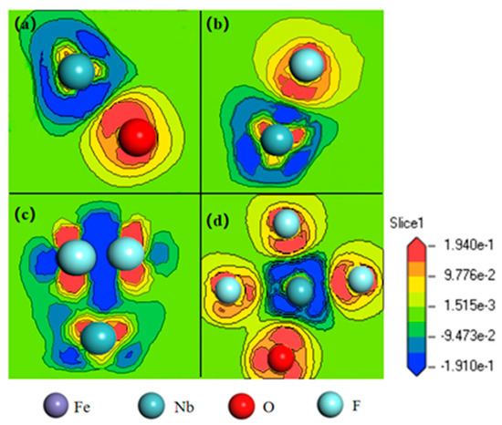 It can be seen from Figure 7a–d that after adding F atom, two F atoms and three F atoms near the Nb atom, the electron density clouds around the F atoms were greater than 0, which means it gained electrons, while the electron cloud density around Nb atoms was less than 0, which means it lost electrons. The electrons moved from the orbital of Nb atoms to F atoms, forming new Nb–F bonds between Nb atoms and F atoms. The Nb–F bonds formed by electron transfer indicated that the Nb–F bonds were ionic bonds.