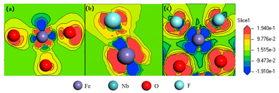 The total energy of each system was the sum of the energy of Nb, Fe, O, F atoms and the energy of Nb–O, Fe–O, Nb–F, and Fe–F bonds in the system, as shown in Formulas (9)–(12):
