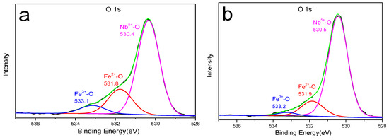 High-resolution XPS spectra of O 1s of the FeNb2O6 after different concentrations of HF leaching: (a) 5mol/L HF; (b) 10mol/L HF.