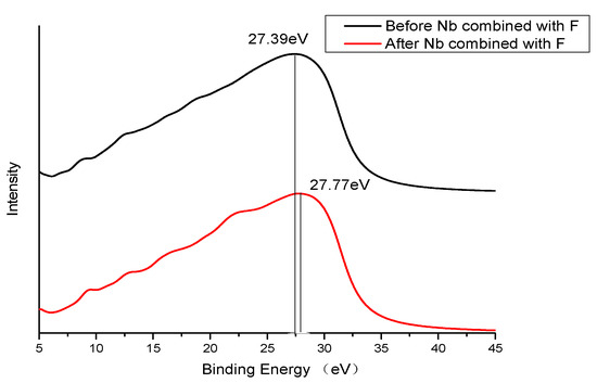 DFT was used to calculate the core-level spectrum, and core holes were set on the 3d orbital of the Nb atom which combined with the F atom and the 2p orbital of the Fe atom which were selected to combine with the F atom. Before and after the combination of F atoms and the Nb atom, the main peak of the EELS spectrum shifted in two states. As shown in Figure 12, the main peaks of the EELS spectrum shifted before and after the combination of F atoms and the Nb atom. The more electrons that were lost in oxidation, the greater the binding energy increased. Before combining with F, the core-level peak of the Nb 3d orbital was 27.39 eV. After combining with F, the main peak moved to 27.77 eV with the increase of 0.38 eV.