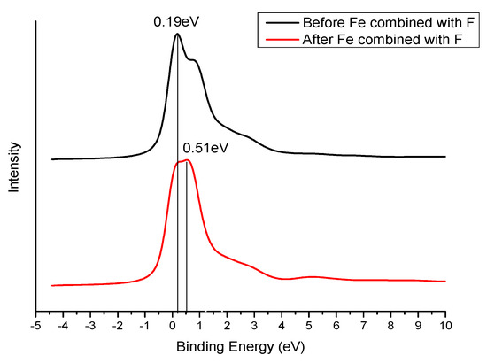 As shown in Figure 13, before and after the combination of the F and Fe atoms, the main peaks of the EELS spectrum shifted to two states, and the EELS spectrum showed that the binding energy of both states increased. The more the number of electrons lost in oxidation, the greater the increase. Before combining with F, the core-level energy peak of Fe 2p orbital was 0.18 eV. After combining with F, the main peak shifted to 0.54 eV with an increase of 0.36 eV. As the number of F atoms bound to Fe increased, the main peak shifted to 1.49 eV, the core-level energy increased by 1.31 eV.
