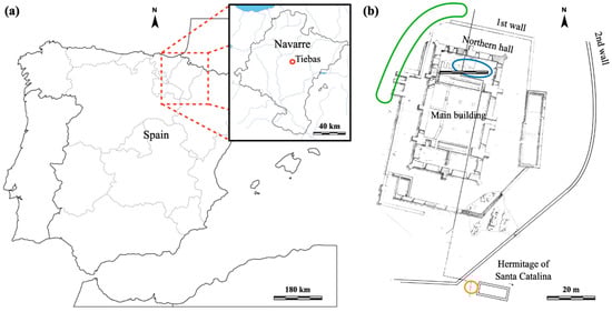 (a) Location of Tiebas Castle in Navarre (northern Spain). (b) Modified early 19th century map of the Tiebas Castle with the locations of where the tiles were found: in situ Northern Hall (blue area), landfill (orange area), out-of-context fragments (green area).