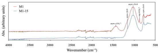 Infrared spectra of samples M1 (red spectrum) and M1-15 (blue spectrum).