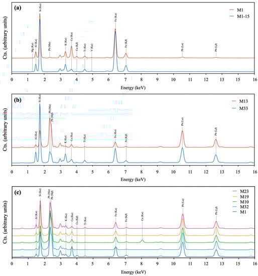 The composition of the glazes was characterized by the significant proportion of lead and silicon (Figure 6c shows the spectra collected on some of the samples, M1, M10, M19, M23, and M32). None of the spectra of the glazes showed Sn. Furthermore, in sample M10 (with dark green color), a slight signal of Cu (Kα at 8.05 keV) appeared.