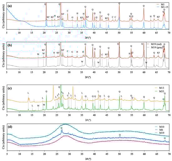 X-ray diffraction patterns of: (a) paste samples M1 and M1-15; (b) the two paste colors of tile M19 (red and grey); (c) engobe samples M13 and M33; (d) glazes of M6, M10 and M19. Abbreviations: Q—quartz; C—calcite; H—hematite; KF—potassium feldspar; D—dolomite; G—gehlenite; M—mica; W—wüstite; L—lead silicoaluminate.