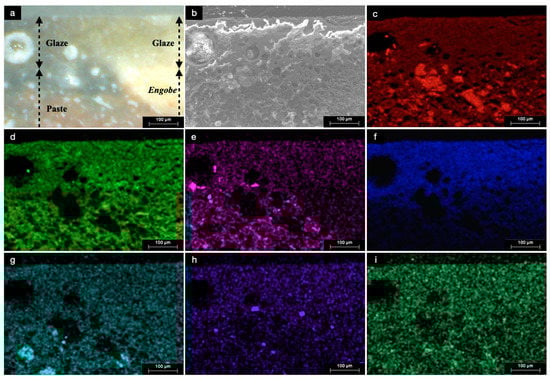 The engobe and paste layers appeared morecontinuous and homogeneous, without air bubbles. The engobes showed compositions mainly based on Si and Al (Figure 9c,d). Quartz crystals also appeared, but smaller than those of the pastes (Figure 9c). The EDS mappings made a better determination of the composition of the engobe possible without the lead contamination coming from the upper glaze layers (as aforementioned in the XRF analyses). Therefore, a kaolinite-type silicoaluminate would be very possibly present in this layer.
