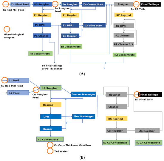 A schematic simplified representation of the zinc (A) and copper (B) process plants and microbial sampling points (orange circles). Additionally, microbial samples were taken from mine water treatment plant (ETAM) In and Out flows, Paste Thickener Overflow and the raw water source Santa Clara reservoir.