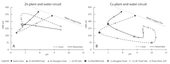 The ORP–pH data (Figure 2) determine where chemical reactions (e.g., oxidation–reduction; precipitation) are occurring and whether there are any major changes in types of reactions in the plants between the two sampling campaigns. If the ORP–pH curve is parallel to the water–oxygen line, the water is in equilibrium. If the ORP–pH curve is perpendicular to the water–oxygen line, then oxidative reactions have occurred. Figure 2 shows that the ORP–pH line from the Santa Clara water to the Zn Rod Mill Feed is perpendicular to the water–oxygen line. Additionally, since the Zn Rod Mill Feed consists mostly of a shortly recycled stream from the paste thickener plant, it indicates that the whole system is oxidative. In the case of the Zn plant, the change from Zn Rod Mill Feed to Zn Rougher Feed is perpendicular to the oxygen–water line for both sampling campaigns. Therefore, it is likely that oxidative reactions occurred in the grinding circuit of the Zn plant. This was not the case for the Cu plant, as the lines from Cu Rod Mill Feed to Cu Rougher Feed are parallel to the water–oxygen line for both samplings. In June, oxidative reactions occurred in the flotation circuit of both copper plant and zinc plant, whereas in November, the water equilibrium was maintained. The changes of pH from the Zn plant to the paste plant are attributed to the addition of lime in the tail plant as a coagulant aid. Such a change is not pronounced in the case of the Cu plant since the Cu plant is operated at higher pH.