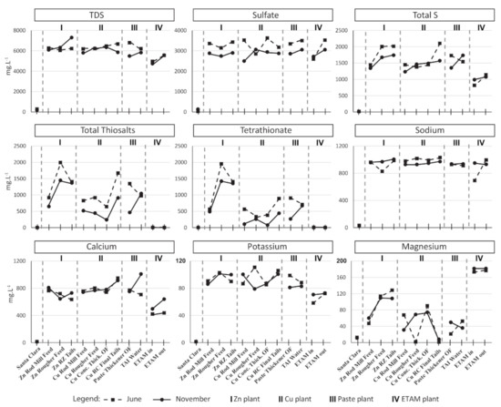 The profiles of major and minor chemical compounds, respectively, throughout the plants and water circuit are presented in Figure 3 and Figure 4. The minor chemical compounds are defined as those that contribute, on average, less than 1% to the TDS. Since the Santa Clara water is freshwater from the local river, its composition differs greatly from the mine waters, characterized by a low concentrations of both minor and major chemical compounds.