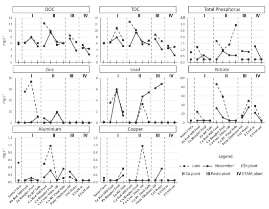 In terms of minor chemical compounds, total organic carbon (TOC) and dissolved organic carbon (DOC) had very similar profiles and concentrations (Figure 4). The only difference was observed in the Zn RZ Tails in June where the TOC concentration was 20% higher than the DOC concentration. In the November sampling campaign, peaks in the organic carbon concentrations were observed in the Zn RZ Tails, the Cu RC Final Tails and the Paste Thickener Overflow samples. In the June sampling campaign, another organic carbon peak was observed in the Cu Rougher Feed sample. Phosphorus concentrations varied greatly between the sampling campaigns. Elevated carbon and phosphorus concentrations are likely a consequence of flotation and thickening reagent additions. During both sampling campaigns, three nitrate concentration peaks were observed from the Zn and Cu Rougher Feeds, the ETAM In, and the ETAM Out samples. The concentrations of metals in the process water were generally lower than the limit of detection, except for lead. High concentration of lead was observed in both the copper plant and the zinc plant. In November, a high concentration of lead was also observed in the water circuit (TAI Water, Paste Thickener Overflow and ETAM In waters). The variations in metal concentrations are difficult to interpret since several factors, such as ore mineralogy, oxidation degree and variation of pH, can have an effect.
