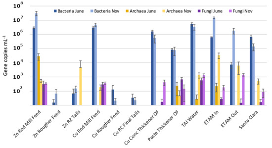Archaeal 16S rRNA gene copy counts ranged from below the detection limit to 3.4 × 104 mL−1. The ETAM In sample in November and the Zn Rod Mill Feed sample in June had the highest archaeal gene copy numbers. Archaea were more frequently detected in November samples than in June samples where archaea were below the detection limit in several samples. Differences between samplings were great in all samples containing archaea. However, no clear trend in samples of either sampling occasion having more archaea was observed (Figure 5).