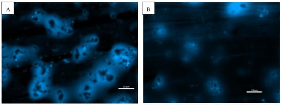 Epifluorescence image of DAPI (4′,6-diamidino-2-phenylindole) stained (A) Zn RZ Tail June sample and (B) Cu Rougher Feed November sample. Cells appear as bright blue spots and residual stain as paler blue, especially around the black mineral particles. The scale bar indicates 10 μm.