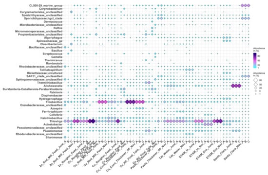 Bacterial genera containing at a minimun 5% relative abundance in at least one sample. Sampling was performed in June and November 2018 originally with triplicate samples but only samples with over 90 reads are shown. The June Cu Rougher Feed sample represents water phase (A) and a mixture of water and solids in the sample (B). The bacterial genera are presented on the left of the graph and the relative abundances of the different genera in each sample are represented by a gradient shading and size of the diamonds.