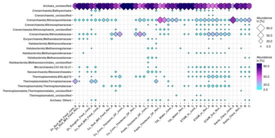 Clearly the biggest group of archaeal sequences remained as unclassified archaea (Figure 8) by the amplicon sequencing. The most prevalent of the identified archaeal classes included ammonia oxidizing Nitrososphaeria of the phylum Crenarchaeota and Thermoplasmata of the Thermoplasmatota phylum.