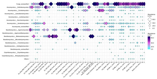 The relative abundance of the main fungal classes, other minor abundance classes are combined into Others. Sampling was performed in June and November 2018 originally with triplicate samples but only samples with more than 20 reads are shown. The June Cu Rougher Feed sample represents either water phase, mixture of water and solid, or solids. The fungal classes are presented on the left of the graph and the relative abundances of the different classes in each sample are represented by a gradient shading and size of the diamonds.