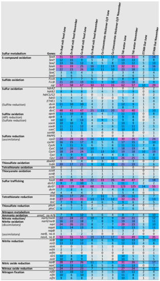 The abundance of identified genes is based on anvi’o’s term “detection”, which indicates the proportion of the sequence of a predicted gene that is covered by the mapped reads, i.e., 0 to 1. If the “detection” for any specific gene is 1 the whole gene sequence can be found back-mapped from the sequence reads, whereas if the “detection” is only 0.5, only 50% of the gene sequence is covered by the sequence reads. The “detection” does not account for the coverage of the gene. It was assumed that a high “detection” value for a gene was equal to good coverage of the gene, as the total coverage was only 8 times at most. Sulfur and nitrogen compound oxidation and reduction abilities (Figure 10), glycolysis, oxidative phosphorylation, pentose phosphate, Entner–Doudoroff pathway and some fermentation-related genes (Figure S2) and heavy metal resistance genes (Figure 11) were studied from the gene “detection” data.