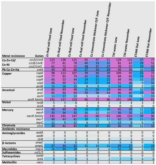 Heavy metal-related genes were detected abundantly in all samples, which was obvious compared to prevalence of antibiotic resistance genes (Figure 11). Similarly to the cases of sulfur, nitrogen and general energy metabolism, the lowest gene abundancies were found in both Cu Concentrate Thickener Overflow samples and in the June ETAM Out sample, and in the November Cu Rod Mill Feed sample. Copper, zinc, nickel, cobalt and chromium are essential trace elements required by numerous metalloenzymes in microorganisms. However, in high concentrations they are toxic for microbial cells and need to be controlled. Several heavy metal resistance protein genes were detected, most abundantly multimetal cobalt-zinc-cadmium/cobalt-nickel and copper resistance proteins. Genes for arsenic, mercury and chromate resistance proteins were also abundantly detected in addition to Lead-cadmium-zinc-mercury resistance gene. Some antibiotic resistance genes were detected, especially for β-lactams and macrolides.