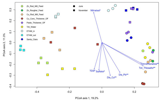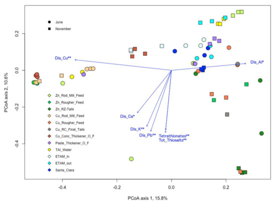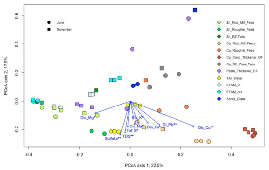 The principal coordinate analysis (PCoA, Figure 12) of the bacterial communities (amplicon sequencing data) together with chemical parameters showed no trend in placements between June and November samples but there was separation between sampling times for most sampling points. There was also a separation between the copper and zinc plant samples as the copper plant sample points mostly fell on the right side of the plot towards higher copper and lead concentrations, whereas the zinc plant and water circuit samples fell on the left side of the plot with higher magnesium concentrations. The raw water Santa Clara November samples were clearly separated from the other samples, but the June samples were clustered tightly in the centre of the plot amid the process samples. Based on the microbial taxonomy, the Santa Clara June and November samples contained the same taxonomical groups as the other samples, but the relative abundances were different from the other samples. Chemical parameters that affected the microbial communities most significantly (p < 0.001) were dissolved copper concentration, sulfate and TDS. In addition, the amount of dissolved magnesium, potassium, sodium, lead and calcium and total sulfur significantly (p < 0.01) affected the bacteria. Concentrations of dissolved copper, lead and calcium, mostly affected the copper plant samples and dissolved magnesium affected the zinc plant samples. The in situ measured parameters T and redox showed a significant (p < 0.001) effect on bacterial communities (Figure S4). However, as all the in situ parameters were measured from only a limited number of samples, the analyses covered only about half of the samples, and no clear connection with any specific sample type and measured parameters was indicated.
