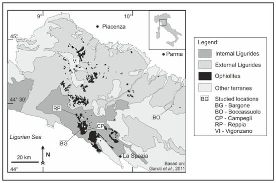 Ophiolite units representing the Piedmont-Ligurian Basin of the Neotethyan Ocean occur in the Western Alps and the Northern Apennines. While the former (west of the Sestri-Voltaggio Line) underwent high pressure low temperature metamorphism, the latter (east from the Sestri-Voltaggio Line) shows only the effects of low pressure and low temperature sea floor alteration without the overprinting of Alpine metamorphism. The non-metamorphosed oceanic crust fragments form the Liguride Nappe (Figure 1). The Ligurian Ophiolites consist of fragments of the lithosphere underlying the Liguria-Piedmont Ocean that was formed by the Jurassic divergence of the European and the Adriatic plates in the western limb of the Neotethys ocean [,]. This ophiolite unit consists of an incomplete ophiolitic sequence in which the sheeted dyke complex and the transition zone are missing []. The Ligurian Ophiolites are conventionally divided into Internal and External Ligurides that represent the oceanic crust in two different paleogeographic environments: one in proximity to the rifting zone of an opening ocean (Internal Ligurides) and the other closer to the narrow Adria continental marginal basin (External Ligurides) [].