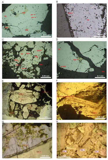 In all of the studied stockwork zones, the most abundant ore mineral in the veins was pyrite, which occurs as anhedral to euhedral grains in association with other sulfide minerals. Pyrite shows various textural relationships with quartz. It fills up open spaces among euhedral-drusy quartz crystals and also penetrates quartz along fractures. However, quartz also fills up fractures of pyrite and pyrite inclusions in growth zones of quartz also occur. These textures indicated that several generations of quartz and pyrite precipitated during the formation of the veins (Figure 2A,C–F). Pyrrhotite exclusively occurs as inclusions in early pyrite and it appeared that these inclusions were remnants of replacement processes (Figure 2A). This pyrite-pyrrhotite association was the earliest precipitation in the veins. Sphalerite has two varieties. One type of sphalerite shows chalcopyrite disease suggesting interaction with later Cu-bearing fluids []. The other type of sphalerite is homogeneous without chalcopyrite disease suggesting that it was precipitated later than the interaction with the Cu-bearing fluids (Figure 2B,C,F). Chalcopyrite is also common as inclusion in late pyrite and also along fractures and boundary surfaces between pyrite crystals where chalcopyrite replaces pyrite (Figure 2A,C,D). Rare galena occurs in the form of anhedral grains precipitated in spaces between other sulfides and is therefore among the latest sulfide phases in the ore mineral assemblage (Figure 3).