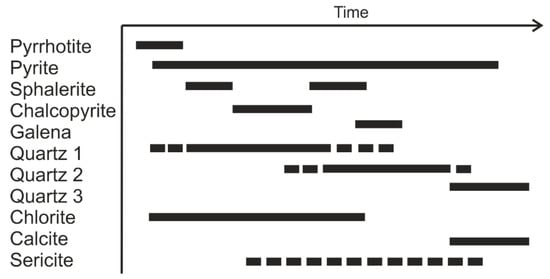 Apart from this, the superimposing hydrothermal pulses were mirrored by the precipitation of the ore minerals as well (Figure 3). The formation of early sphalerite was associated with a pulse of a Cu-rich fluid, resulting in the occurrence of chalcopyrite disease in sphalerite [] as well as the co-precipitation of chalcopyrite. This was followed by the precipitation of late, chalcopyrite-free sphalerite. A similar temporal evolution has been observed in other (Kuroko type) VMS deposits [].