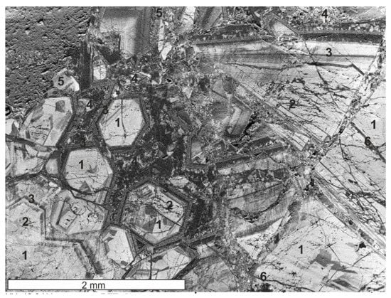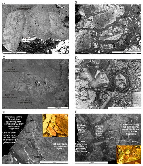 The following textural features of quartz were identified by SEM-CL according to the classification in []: (1) euhedral growth zoning (Figure 4A,C,D), (2) quartz crystals showing homogeneous CL intensity (i.e., CL-bright, CL-dark, CL-grey) (Figure 2F), (3) CL-bright and CL-dark quartz in microfractures of quartz (Figure 4A–D,F) and (4) mottled textures (Figure 4E,F).