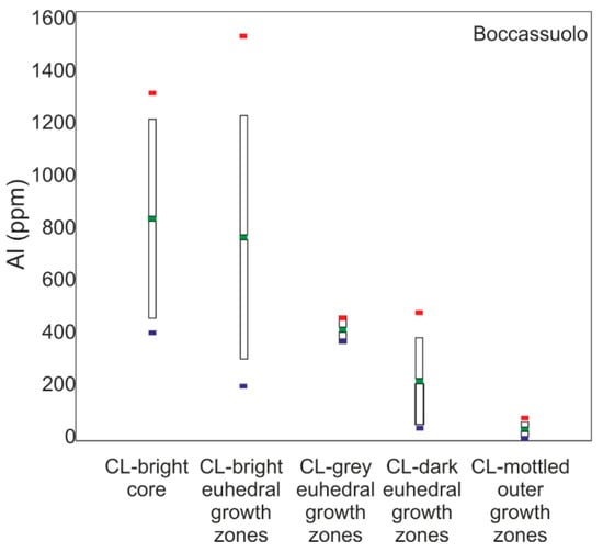 Al content of quartz (Qtz 1) with different CL signatures. Some positive correlation is observable (Boccassuolo) (legend: red: max; green: mean; blue: min concentrations; rectangles: standard deviation).