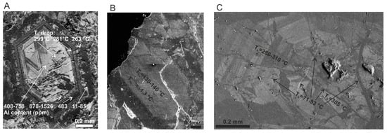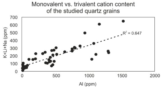 The results of the LA-ICP-MS study indicated that Al and its charge compensating cations (e.g., Na, K,) affected the SEM-CL properties of quartz (see Figure 6 and Figure 10A) but this correlation was not obvious [,]. Al is generally the most abundant trace element in hydrothermal quartz []. In agreement with this, the quartz crystals from the VMS deposits of the Northern Apennines contained up to 1526 ppm Al. The observed positive correlation between Al and the monovalent cations indicated their coupled substitution in quartz. The positive correlation between the monovalent cations and Al as well as the low Ti concentrations (in our case, below a detection limit of 4 ppm) are commonly present in low temperature hydrothermal quartz (i.e., below 300–400 °C [,]). This is also in good agreement with our fluid inclusion data (see Figure 9 and Appendix A Table A2).