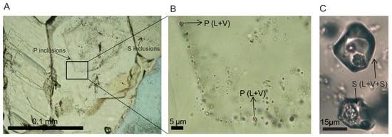 Fluid inclusions in the studied samples. (A,B) primary, liquid + vapor fluid inclusions in a growth zone of an early quartz grain (Qtz 1). Secondary trails cross-cut the crystal boundaries (Campegli). (C) Large liquid + vapor + solid secondary fluid inclusions in an early quartz grain (Qtz 1) (Vigonzano). The solid phase is an accidentally trapped sericite grain (determined by Raman spectroscopic analyses).