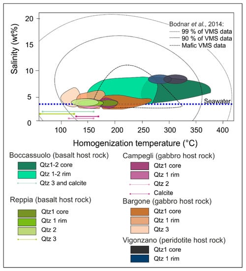 Homogenization temperature vs. salinity diagram of the fluid inclusions from the various Cyprus type VMS deposits in the Northern Apennines. A decreasing Th trend was observable among the different quartz generations as well as from the core to the rim of early Qtz 1. Where it was not possible to measure salinity, only the Th range of those inclusions is shown. Fields of the fluid inclusion homogenization temperature-salinity data for VMS deposits according to [] are also shown.