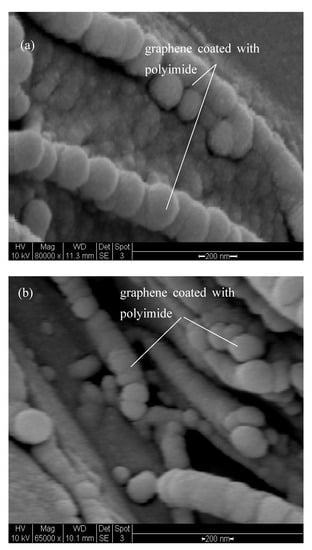 At a higher magnification (×80,000), SEM images show coating of polyimide onto graphene. The images in Figure 3 indicate two regimes in the composites, the bulk polymer and the area surrounded by graphene. Graphene is shown to protrude out of the matrix. These observations are noteworthy as they explain the action of graphene in protecting the underlying polymer matrix from degradation.