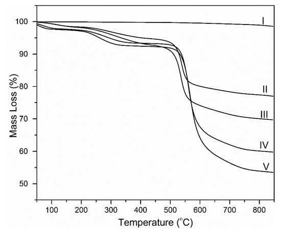 Figure 4. Thermogravimetric mass loss curves of (I) Graphene, (II) PINGS-50, (III) PINGS-30, (IV) PINGS-10 and (V) Neat PI (in nitrogen; β = 30 °C/min).