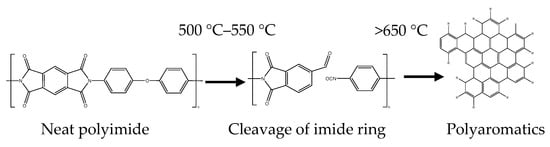 Analysis of major volatile decomposition products evolved indicate that the imide ring is the site of initial degradation [25]. Thermal cleavage of the imide ring leads to the loss of carbon, oxygen, and hydrogen in the form of carbon monoxide, carbon dioxide, water, and other low boiling point products [26]. At temperatures above 600 °C, a cleavage of stronger bonds in the aromatic rings lead to the loss of aromatic hydrocarbons and amines, resulting in the slow degradation of the char [27].