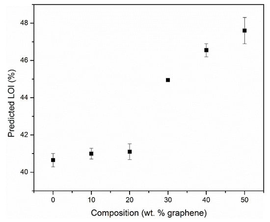 Figure 6. Predicted limiting oxygen index (LOI) versus composition for neat PI and composites containing 10, 20, 30, 40 and 50 wt.% graphene based on Equation (2) ([28]).