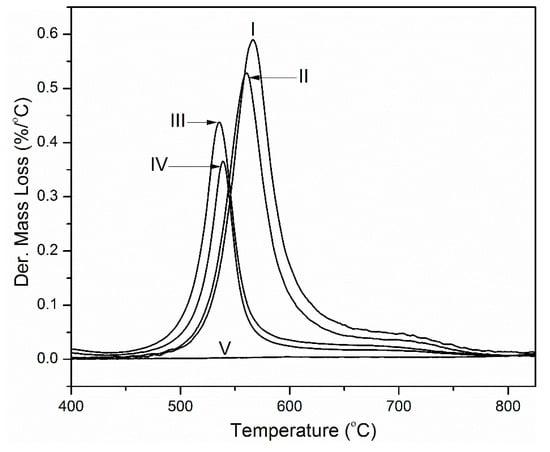 Figure 7. Derivative mass loss curves (I) PI, (II) PINGS -10, (III) PINGS-30, (IV) PINGS-50 and (V) Graphene (in nitrogen; β = 30 °C/min).