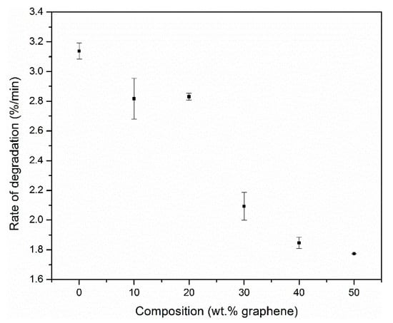 Figure 8. Rate of degradation of the polymer matrix as a function of the percentage of graphene in the nanocomposites (in nitrogen; β = 30 °C/min).