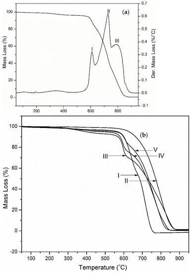 Figure 9. (a) Thermogravimetric and derivative mass loss curve for PI composite containing 50 wt.% graphene showing (I) the PI matrix degradation peak, (II) the PI char/graphene char degradation peak, (III) the graphene char degradation peak (in air; β = 30 °C/min). (b) Thermogravimetric mass loss curves of (I) Neat PI (II) Graphene (III) PINGS-10 (IV) PINGS-30 (V) PINGS-50 (in air; β = 30 °C/min).