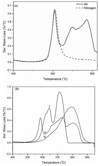 The thermogravimetric analysis of the composite films of about 3–6 mg was carried out at heating rates of 10, 15, 20 and 30 °C/min, respectively, in a temperature range from 25–950 °C in nitrogen and air atmospheres. The TGA tests were performed by using a Q50 Thermal Analyzer purchased from TA Instruments, New Castle, DE, USA.