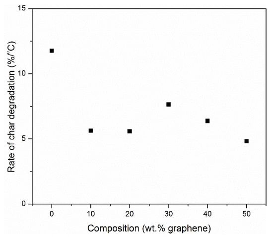 The rate of decomposition of the char was determined from the derivative TGA curves obtained in air. The results, as shown in Figure 11, show an initial decrease of 52% in the rate of char degradation from neat PI to the nanocomposite containing 10 wt.% graphene. The rate fluctuates slightly between the nanocomposite samples containing 10, 20, 30, 40 and 50 wt.% graphene.