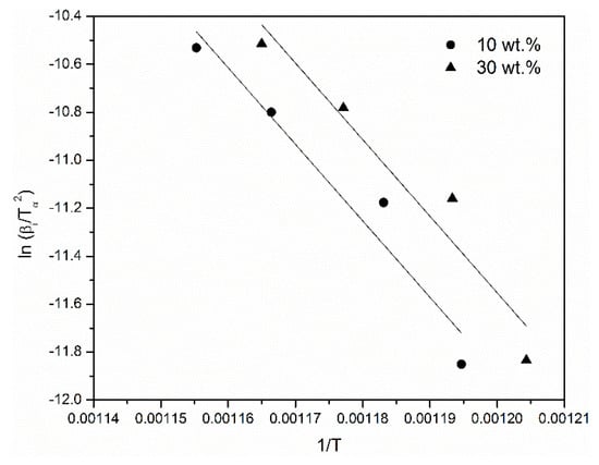 The slope of the linear curve of ln β/T2 vs. −1/T gives the activation energy for each degree of conversion (α). The pre-exponential factor, A, is the intercept of the linear curve [21].