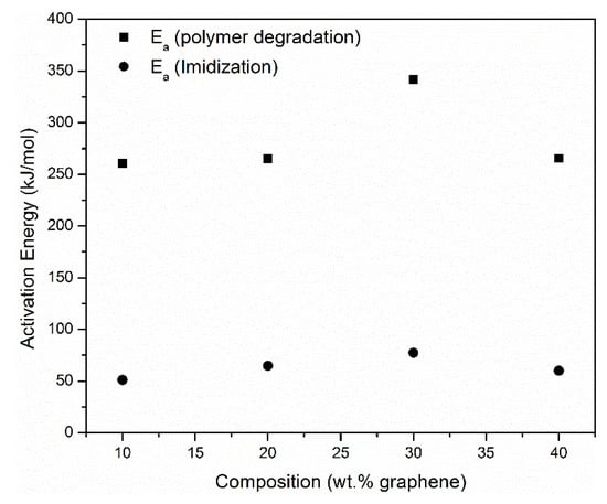 Figure 13. Activation energy of imidization and polymer degradation as a function of composition of graphene in the nanocomposites.