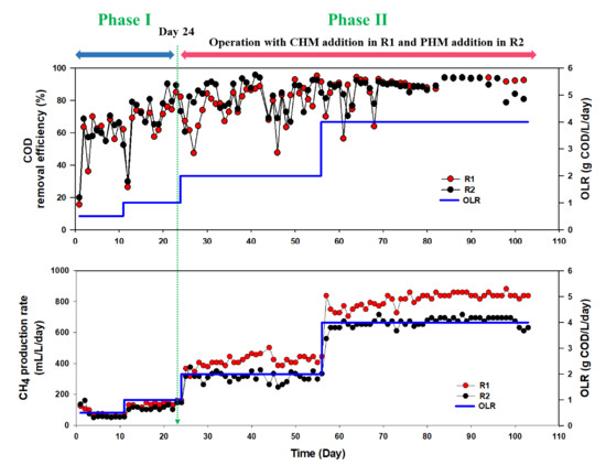 The anaerobic reactor volume was 250 mL, while the working volume was 200 mL. A magnetic stirrer stirred the reactors at 150 rpm, while the outlet and inlet ports of the feed were attached to the top of the reactor. Furthermore, the gas collector was connected to a gas outlet line. A water bath was used as temperature controller at 37 ± 2 °C. Seed sludge was inoculated into 100 mL of the reactor with 100 mL of deionized water. The initial pH was adjusted to 7.0 for optimum reactor operation. After the injection, the reactors were flushed with N2 gas for 3 min to remove the oxygen. Twenty mL of feedstock was prepared at a concentration of 0.5 g chemical oxygen demand (COD)/L, with 10 days hydraulic retention time (HRT) and 0.5 g COD/L/day organic loading rate (OLR). The reactor was operated for 104 days in a sequencing batch mode (0.5 h of feeding, 22.5 h of reaction, and 1.0 h of settling) to prevent washout of the CHMs. CHM and PHM (1400 mg each) were injected into R1 and R2, respectively. The organic loading rate was 0.5 g COD/L/day, while it was increased stepwise to 4 g COD/L after stabilizing the performance in each step. On day 24, CHM and PHM were supplemented to R1 and R2, respectively.