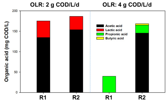 On day 24, CHM and PHM were supplemented to R1 and R2, respectively, and OLR further increased to 2 g COD/L/day. In both reactors, COD removal efficiency was not significantly different, while it was found that CHM addition to R1 led to a gradual MPR increase, reaching 30% higher MPR (426 ± 39 mL/L/day) compared to R2 after PHM addition (321 ± 50 mL/L/day). Organic acids remained below 183 mg COD/L in both reactors, attributed mainly to the acetate (77–79%) and lactate (21–23%) in both reactors (Figure 2). Bicarbonate alkalinity (>5000 mg CaCO3/L) was high enough to prevent significant pH fluctuations, resulting in pH of approximately 7.2–7.4 in both reactors. The positive effect of CHM on AD increased with the increase in OLR to 4 g/L/day (days 59–104). The MPR was 839 ± 15 mL/L/day in R1 and 675 ± 24 mL/L/day in R2. Under these conditions, the CH4 content in biogas was 68% in R1 and 60% in R2. A gradual reduction of total organic acid with no acetic acid was detected in the effluent of R1, indicating that electrical advance stimulates methanogen conversion from acetate to methane [18]. Meanwhile, the total organic acid content of R2 was the same as that corresponding to an OLR of 2 g COD/L/day.