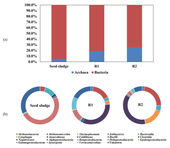 As shown in Figure 3a, a gradual increase in OTUs associated with archaea in R1 and R2 was detected (18.8% at R1 and 25.4% at R2), and the archaea/bacteria (A/B) ratio was 0.23 (R1) and 0.34 (R2). Meanwhile, the abundance of archaea in the seed sludge was only 5.2%, corresponding to an A/B ratio of 0.05. This result indicates that the archaeal community was developed in both reactors. Regueiro et al. [20] reported that the quantitative percentage of A/B ratio in AD varies from to 0.1–0.7. In addition, given that higher MPR in R1 compared to R2 was associated with lower A/B ratio, the effect of CHM on the syntrophic metabolic pathway associated with DIET in R1 may be positive.