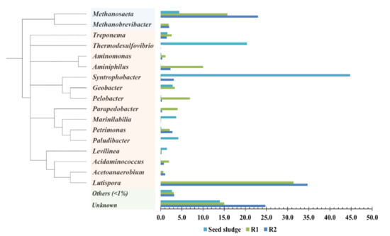 The distributions of the microbiome at the genus level are shown in Figure 4. Syntrophobacter (44.8%) was found to be predominant in the seed sludge, followed by Thermodesulfovibrio (20.4%), Methanosaeta (4.4%), Paludibacter (4.1%), Marinilabilia (3.6%), Geobacter (2.8%), and Levilinea (1.5%). Syntrophobacter and Thermodesulfovibrio are known to syntrophically oxidize organic acids and can induce IET to provide H2 to methanogens [10]; however, their abundance decreased as the operation progressed while giving way to newly emerged bacterial microbiomes in both R1 and R2. Lutispora and Methanosaeta became the main members, whose total amount accounted for 47.1% and 57.7% in R1 and R2, respectively. Other genera, including Aminiphilus, Pelobacter, Geobacter, Parapedobacter, and Methanobrevibacter, also became more abundant in both R1 and R2.