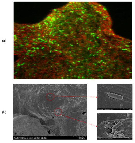 (a) The confocal laser scanning microscopy (CLSM) and (b) scanning electron microscopy (SEM)images of biofilm attached to the surface of CHM taken from R1 at the end of operation.