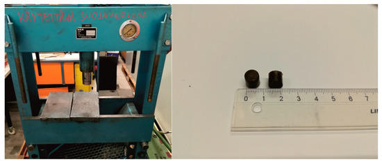 Hydrolysis lignin was used in the experiments in powdered form or as briquettes. This was done to evaluate the effects of biomass agglomeration on the pyrolysis yield and porous structure and reactivity of the char. The particle sizes for the lignin raw material varied a lot from fine powder to agglomerates as large as 80 mm in diameter. Therefore, the material was ground and sieved to a particle size of less than 0.5 mm before briquetting. The briquetting of the lignin was performed with a hydraulic press and a press mold, as presented in Figure 1. The compressive force used in briquetting was 10 kN and the compression time was 20 s. The compression resulted in mini-briquettes of approximately 8 mm in diameter, 9 mm in height, and 0.5 g in weight. The lignin that was tested in powdered form was ground to a particle size of less than 0.5 mm in diameter after the pyrolysis. Demirbas, 2004 [16] reported that a smaller particle size of a biomass results in a lower yield in pyrolysis. Therefore, the biochar was ground after the pyrolysis in the case of fine powder to homogenize the material.